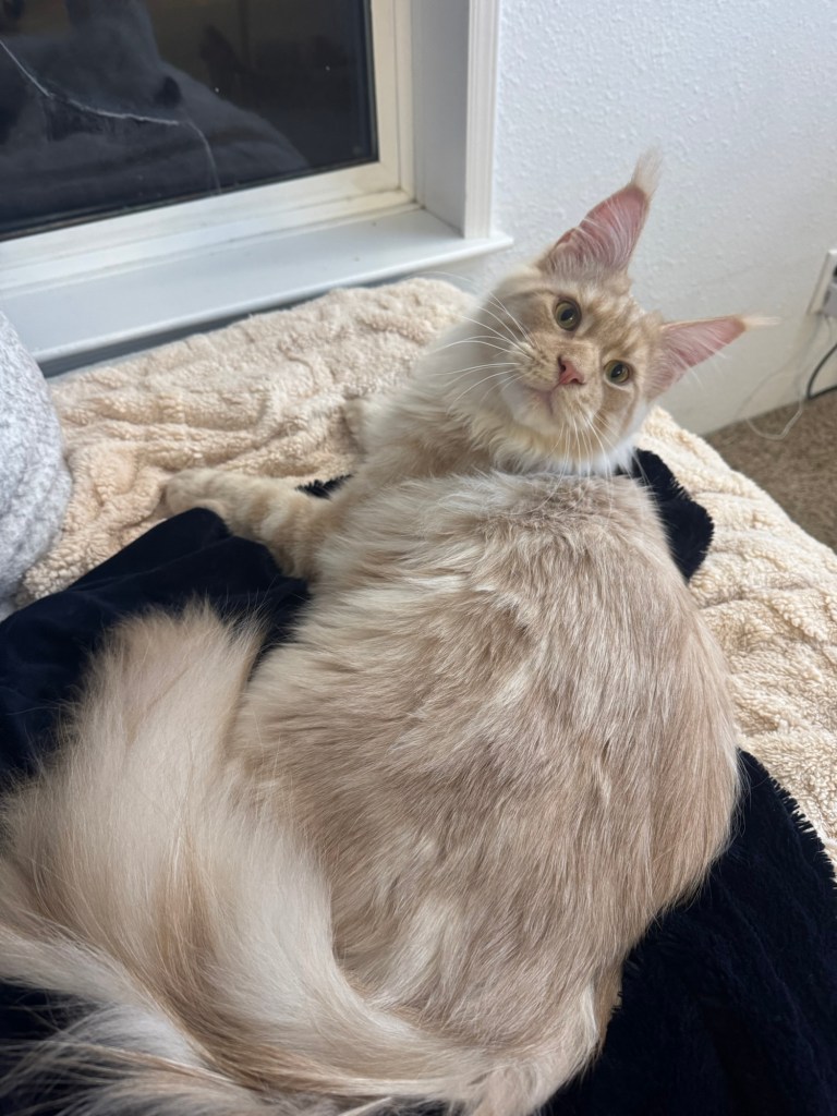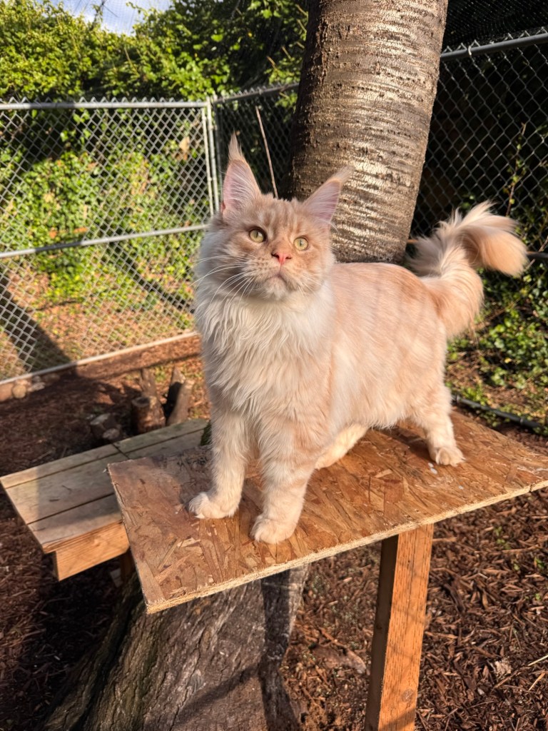 Maximus will be year in June 2026 , he’s huge boy about 20lb already. He’s sooo sweet loves to play on the tree outside and roll in wood chips , always happy boy .we can’t wait to have baby’s from him